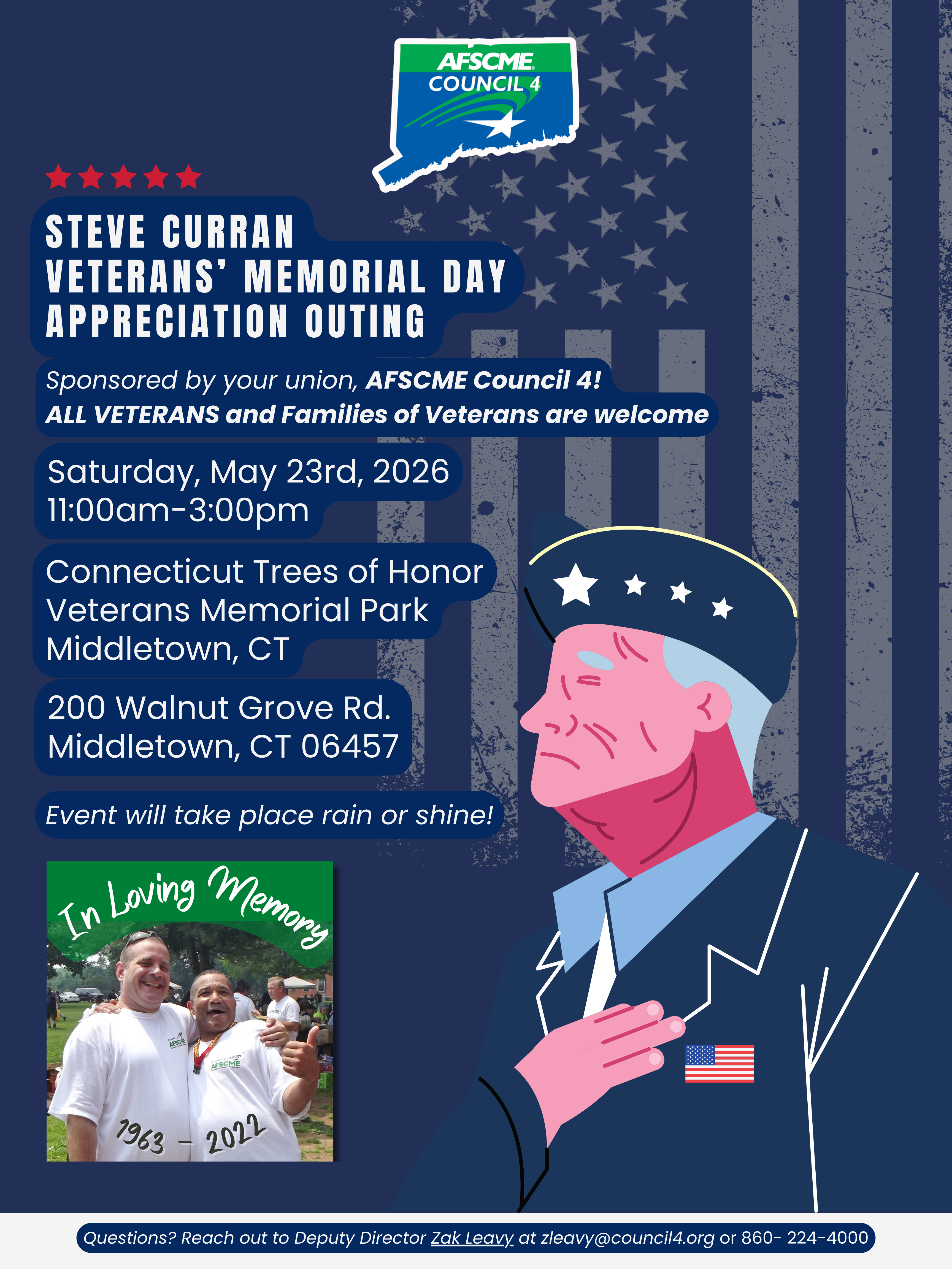 We gather to honor the memory of our veterans and pay tribute to those who served. Please join AFSCME Council 4 at the Steve Curran Veterans’ Memorial Day Appreciation Outing—11AM to 3PM at Veterans Memorial Park in Middletown—as we reflect, remember, and stand in solidarity with those who gave so much.